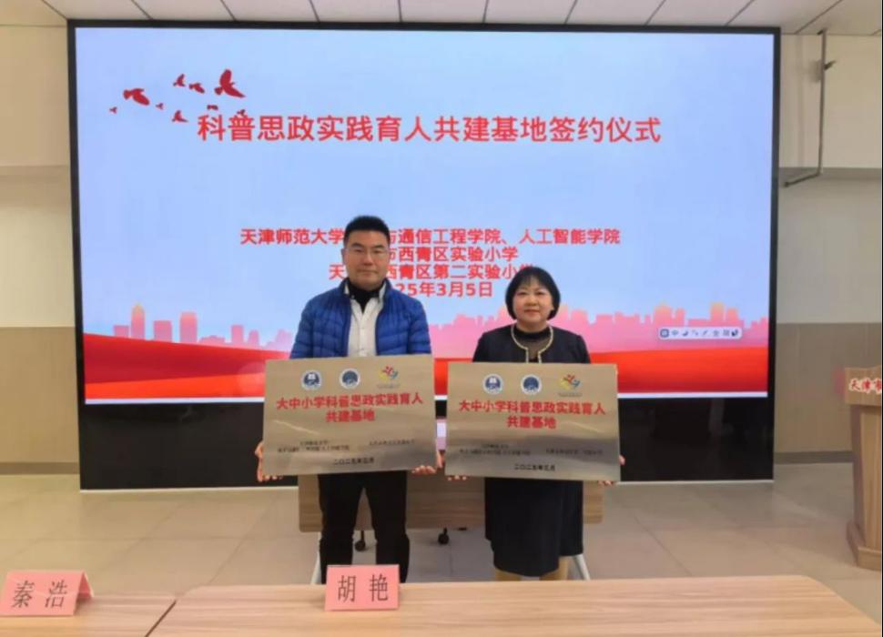 本站讯(通讯员 梁月)为推动基础教育与高等教育的深度融合,3月5日,电子与通信工程学院、人工智能学院开展“弘扬雷锋精神 青春志愿同行”3・5学雷锋日主题活动,赴西青区实验小学教育集团开展共建合作与科普讲解活动。学院党委副书记秦浩与西青区实验小学教育集团校长胡艳共同出席活动并签订科普思政实践育人项目协议,学生科普讲解志愿服务团开展了“探秘AI,智取未来”科普讲解活动,为来自西青区实验小学、第二实验小学、杨柳青二中、杨柳青一中四所学校的百余名师生代表带来了一场精彩纷呈的人工智能科普盛宴。