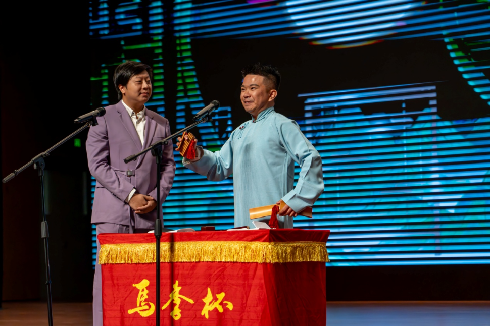 女演员冯芮一段明快昂扬的快板《天安门广场看升旗》为本次演出开场,紧接着便是杨皤、王子晨根据当前热点AI人工智能创作的《假如生活AI了你》。尚琦、杨宗秋的相声《爱情导师》将青年人对爱情的困扰生动地搬到舞台之上,触动了学生们心中的阵阵涟漪。孙弢、孙琦带来《非常影评家》,电影生活巧妙结合,现场气氛热烈。来自马达加斯加的唐磊和来自肯尼亚的孔爱凯对相声文化的喜爱让他们跨越了语言的限制,《歪批百家姓》将汉语幽默发挥得淋漓尽致,与观众小朋友的互动更是惹得观众哄堂大笑。董建春和李春熠两位经验丰富的演员最后出场,《三打白骨精》台风扎实,技巧多样,将本场演出推向高潮。