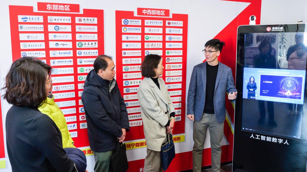 张亚飞热情接待了学院一行,并详细介绍了照片直播、虚拟数字人、地标校园以及校庆云平台等公司核心业务板块以及公司的业务模式和发展方向。张亚飞还向学院师生展示了数智化服务平台,并分享了公司与其他高校合作的成功案例及相关产品成果。
