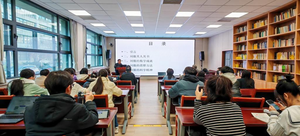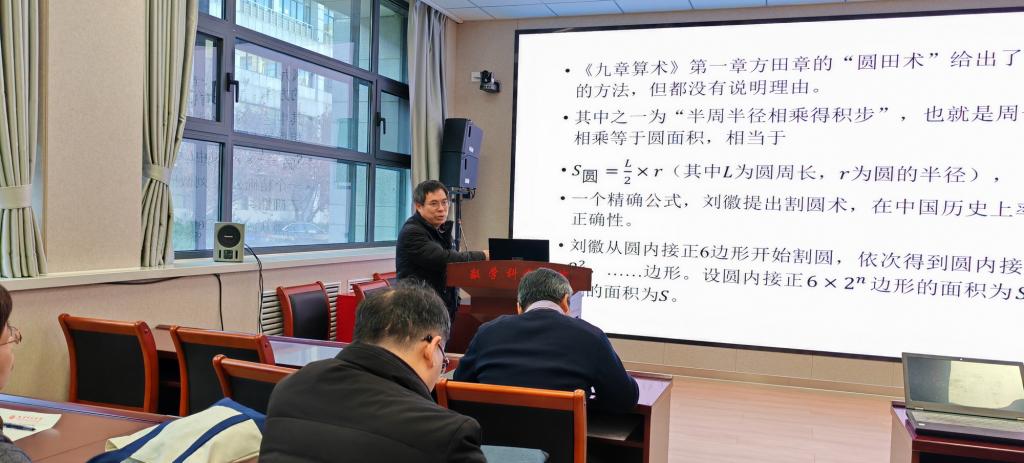在讲座中,邹大海研究员介绍了魏晋时期我国伟大数学家刘徽的生平事迹和数学成就,如刘徽率的理论、割圆术、重差术、刘徽原理、牟合方盖等,这些成就不仅包括分数四则运算法则、比例算法、面积和体积算法等基础数学知识,还涉及了线性方程组、一元二次方程求根等高级数学内容。邹大海表示,刘徽的思想方法具有强烈的证明意识,他尊重经典但不盲从,通过严谨的逻辑推理和创新性的转化,将哲学概念转化为科学概念;所设计的牟合方盖等几何模型,体现了强烈的设计思想和实事求是的科学态度,这些都值得后人继承和发展。邹大海指出,去年11月召开的第四十二届联合国教科文组织大会上,刘徽诞辰周年系列纪念活动获得审议并通过,这表明刘徽已经得到全世界的关注和赞誉。