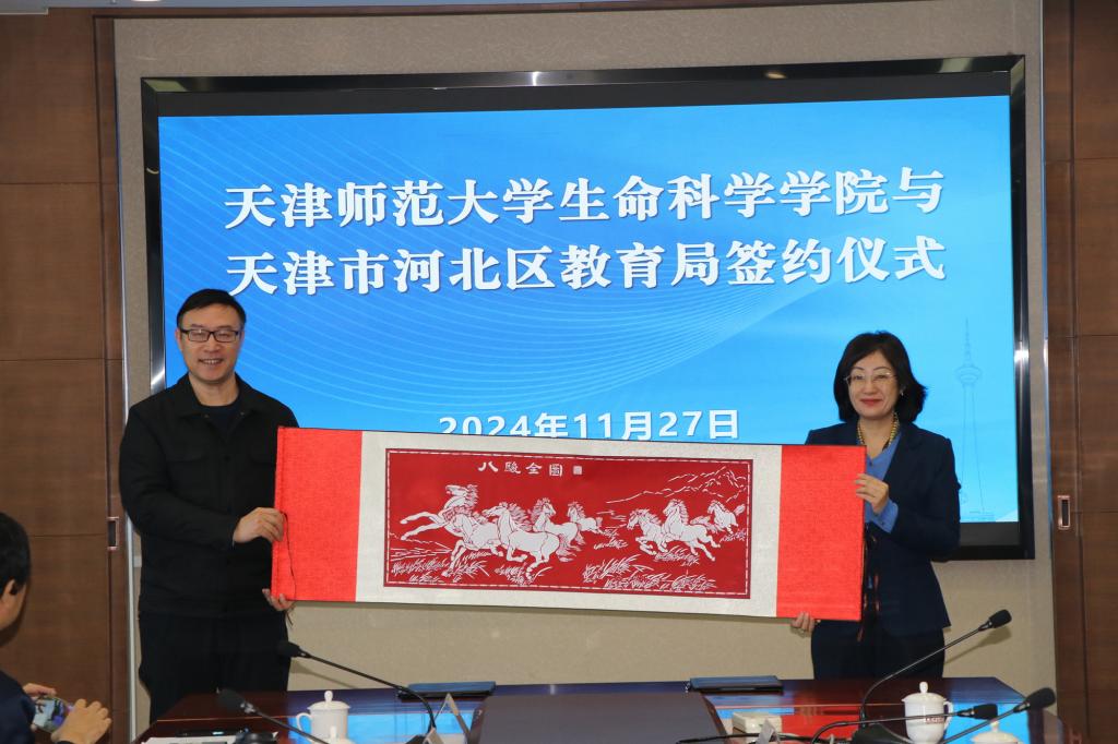 会上,贝博相关工作负责同志对贝博合作交流情况、师范生培养情况进行了介绍。河北区教育局向生命科学学院赠送剪纸工艺品《八骏图》,双方共同签订合作共建教学实践基地协议书,进行了河北区中学生物学教师培训中心挂牌仪式。河北区师生代表参观了贝博生态记忆馆和生命科学学院实验教学示范中心。