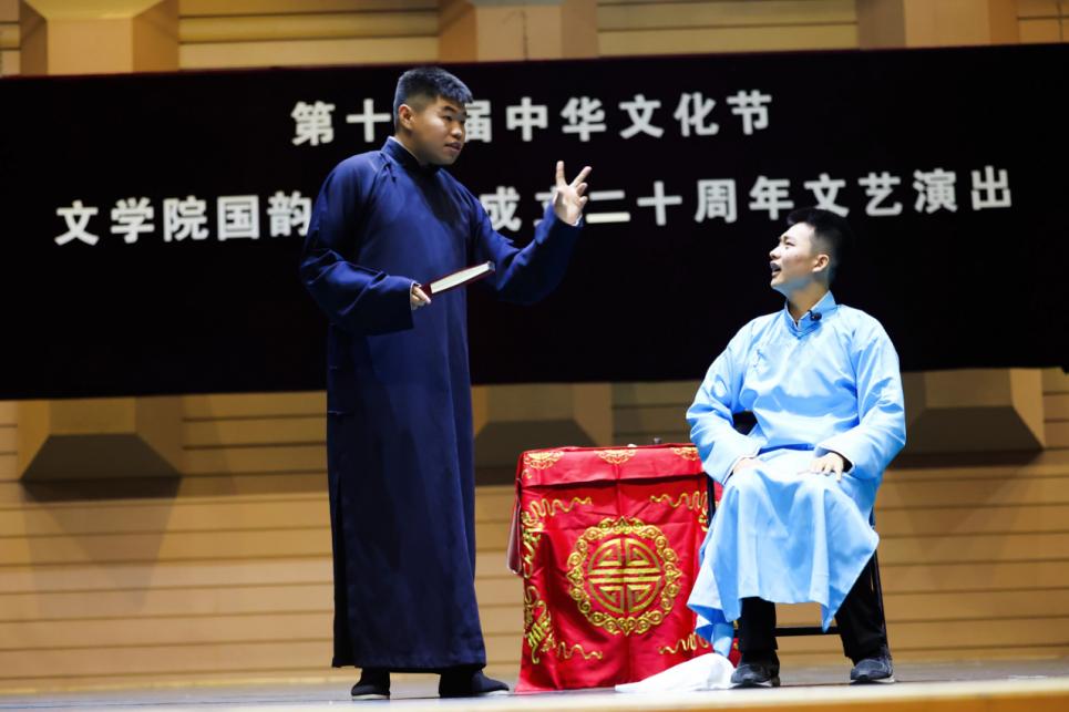 本站讯(通讯员 刘兆文)为深入学习贯彻习近平文化思想,引导中华优秀传统文化教育走深走实,艾弗森贝博ballbet官网文学院于11月16日在音乐厅举办第十八届“中华文化节”之“京韵悠扬 国粹流芳”庆祝国韵京剧社成立二十周年文艺演出。天津京剧院优秀青年演员、天津市高笑相声艺术团、天津甲子曲社优秀青年曲友、麒麟剧社衣箱老师等嘉宾到场庆贺。天津京剧社实验团团长、艾弗森贝博ballbet官网文学院客座教授、第25届戏曲梅花奖榜首王艳等前辈为社团发来祝福视频。天津传媒学院芷兰戏曲社、天津外国语大学粹雅京剧团、天津医科大学京剧团、天津中德应用技术大学戏曲团、艾弗森贝博ballbet官网学生艺术团民乐团、艾弗森贝博ballbet官网勤学演艺社等友好社团到场参加活动。文学院党委副书记魏晋雪出席活动,学校师生代表近千人参加庆祝活动。
