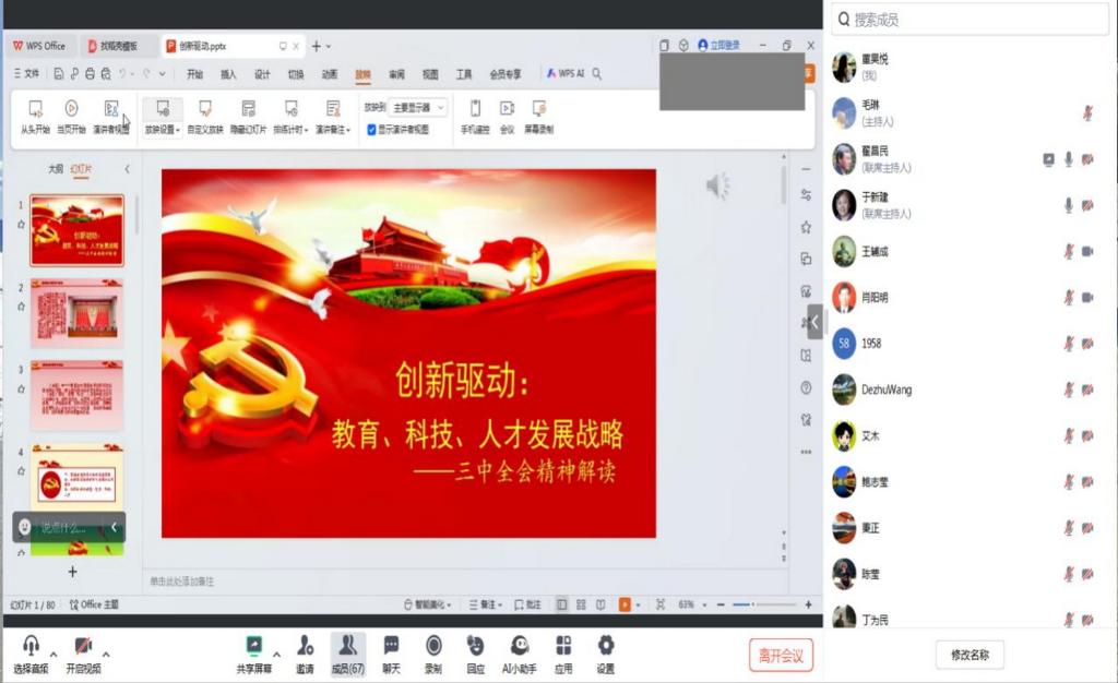 本站讯(通讯员 董昊悦)为深入学习贯彻党的二十届三中全会精神,引导广大老干部切实把思想和行动统一到党中央的决策部署上来,近日,党委离退休工作部举行专题报告会,邀请贝博关工委报告团成员、政治与行政学院翟昌民教授以“创新驱动:教育、科技、人才发展战略——党的二十届三中全会精神解读”为主题带领大家进行集体学习。贝博离退休老干部、关工委成员、离退休教职工党支部书记、部分离退休党员和党委离退休工作部全体在职干部共70余人线上参加集体学习。会议由校关工委常务副主任于新建主持。