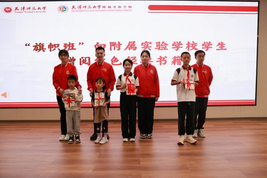 活动中,“旗帜班”学员向附属实验学校学生赠阅《长征》《红星照耀中国》等青少年版红色经典书籍和《读读童谣和儿歌》《和大人一起读》等中小学课外必读书目,鼓励中小学生们热爱阅读,刻苦学习,树立理想,砥砺品格,增长本领,和祖国共成长。