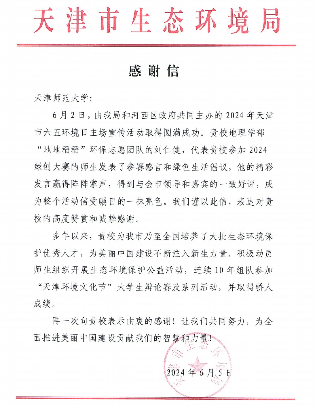 信中提到,在2024年天津市六五环境日主场宣传活动中,地理学部“地地稻稻”环保志愿团队的刘仁健,代表贝博参加2024绿创大赛的师生发表了参赛感言和绿色生活倡议,得到与会市领导和嘉宾的一致好评。多年来,艾弗森贝博ballbet官网为我市乃至全国培养了大批生态环境保护优秀人才,积极动员师生组织开展生态环境保护公益活动,连续10年组队参加“天津环境文化节”大学生辩论赛及系列活动,并取得骄人成绩。特此对刘仁健同学提出表扬,并向艾弗森贝博ballbet官网表示由衷的感谢。