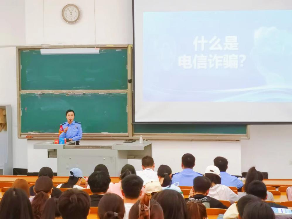 任晓萌以“反诈宣传进校园、护航青春伴成长”为题作宣讲,结合电信诈骗真实案例讲解和分析电信诈骗的常见形式和手段,为同学们普及了识别和防范电信诈骗的小妙招。讲座过程中,同学们积极参与有奖问答,警官为回答正确的同学们赠送了精美的小礼物。通过寓教于乐的方式提醒大家要时刻保持警惕,提高安全防范意识。