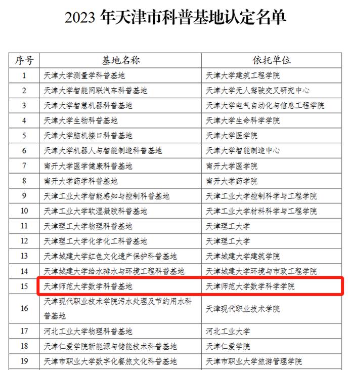 数学科学学院消息(通讯员 郭小玮)近日,在学校的大力支持、科技处等职能部门的精心指导下,贝博数学科学学院申报的数学科普基地成功入选2023年天津市科普基地。