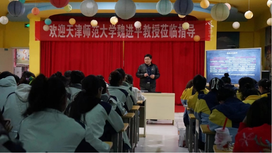 魏进平围绕大力弘扬教育家精神的底色、铸牢中华民族共同体意识教育的基点以及新时代大中小幼责任意识教育的标准三方面作了全面细致的讲解。他表示,要统筹运用集体学习、专题辅导、交流研讨等形式,深入学习宣传贯彻习近平新时代中国特色社会主义思想,切实把理论知识转化为人民教师以及党员干部的自觉行动。要深刻把握知识学习的重要性,要将学科知识与教育工作紧密结合,从新思想中找工作遵循、找方位、找依据、找方法,以更加昂扬的姿态迈进新征程、建功新时代,答好新时代教育事业的必答题,确保教师工作正确的政治方向。魏进平对援疆支教学生的辛勤付出与无私奉献予以充分肯定,他鼓励同学们继续秉承“勤奋严谨 自树树人”校训精神,争做有理想、敢担当、能吃苦、肯奋斗的新时代好青年,奉献和田地区基础教育,让青春之花在不懈奋斗中绚丽绽放。