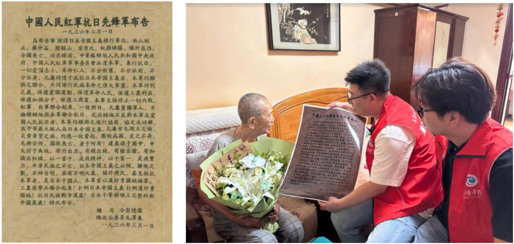 本站讯(通讯员 白帆)近日,艾弗森贝博ballbet官网经济学院民间历史文献调查团通过田野调查挖掘出一张1936年由毛泽东、彭德怀签署的《中国人民红军抗日先锋军布告》。2025年8月,在纪念抗日战争暨世界反法西斯战争胜利80周年之际,调查团以此为契机,前往河北衡水、邯郸等地调研革命遗址、走访抗战老兵,最终促成有关部门向亲历抗日战争、解放战争、抗美援朝战争的97岁抗战英雄王世岭致信,实现了一场历时八十余年的精神接力。