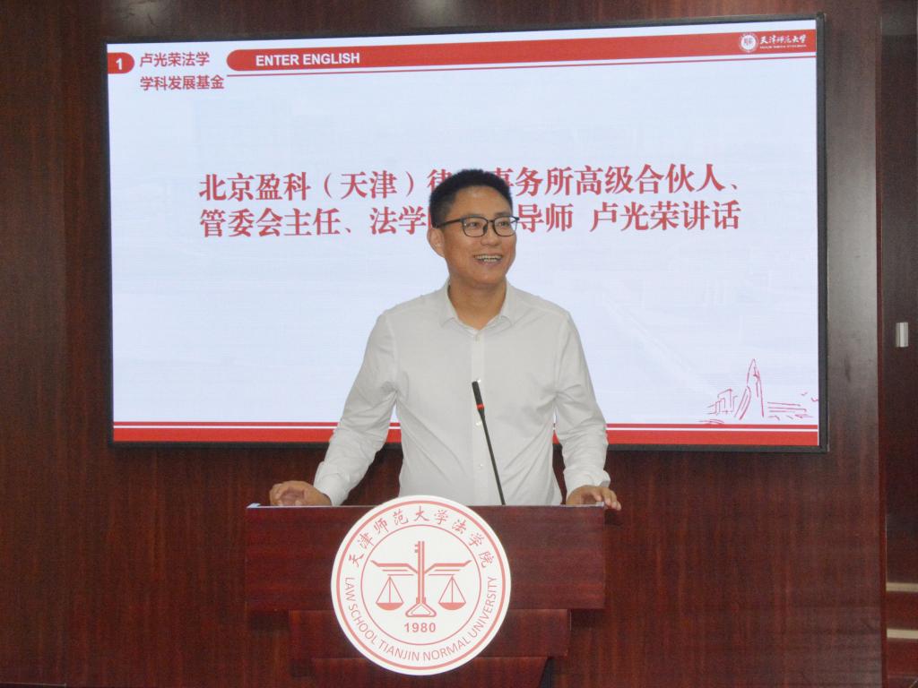 本站讯(通讯员 侯慧秀)10月16日下午,法学院“卢光荣法学学科发展基金”颁发仪式在兴文楼B区511模拟法庭举行。校党委副书记董洪霞,北京盈科(天津)律师事务所高级合伙人、管委会主任、法学院实践导师、校友卢光荣出席仪式,学院领导班子、全体教师参加仪式,仪式由法学院党委书记何璐主持。
