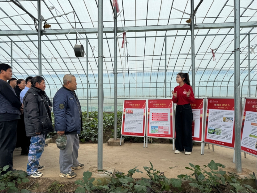 沿着乡间小路前行,师生们走进精品蔬菜园。马克思主义学院副院长王雪超结合眼前景象讲解道:“实现农业现代化,我们第六埠村不仅要继续夯实‘藏粮于地’的基础,建设好高标准农田;更要激发‘藏粮于技’的动能,用科技为农业插上翅膀,让优质农产品产出更高效益,这深刻体现了新发展理念在乡村振兴中的实践要求。”学生理论宣讲团成员刘梓晗同学则以“一粒米”的全产业链故事为例,描绘了农产品从种植到加工、销售的增值路径。“咱村的蔬菜品质好,只要打响品牌、延伸链条,就能卖上好价钱,这就是高质量发展的门道。”田间劳作的村民指着长势良好的萝卜,对“科技农业”有了更清晰的憧憬。