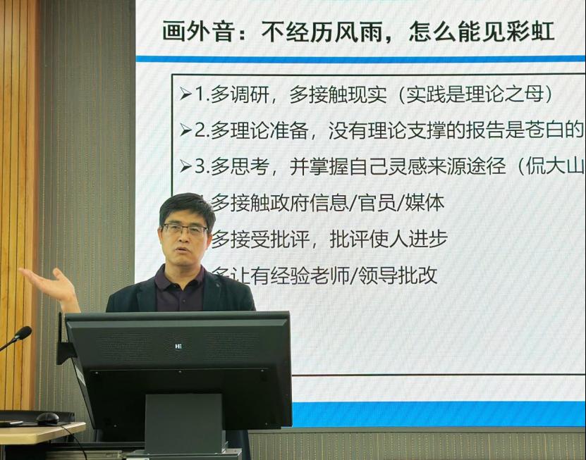围绕“咨询报告的类型与选题”,张贵教授从战略性、对策性、应用性等不同类型出发,详细分析了选题应把握的“四个维度”:一是紧扣国家战略与中央精神,二是聚焦地方发展与现实需求,三是立足本校本院学科特色与数据优势,四是兼顾时效性与前瞻性。他结合自身经历,介绍了从“领导关注点”中提炼学术问题、从“基层困惑”中凝练政策选题的具体方法,为在场师生打开了智库研究选题的新视角。