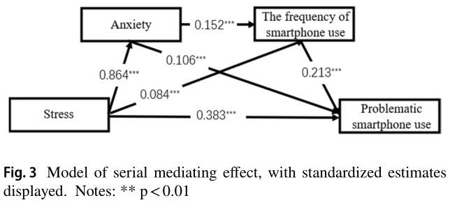 此研究结果指出,青少年压力通过焦虑和智能手机使用频率直接或间接地与问题性智能手机使用严重程度呈正相关。因此,未来的研究应该关注青少年的焦虑及其与智能手机使用频率的关系。