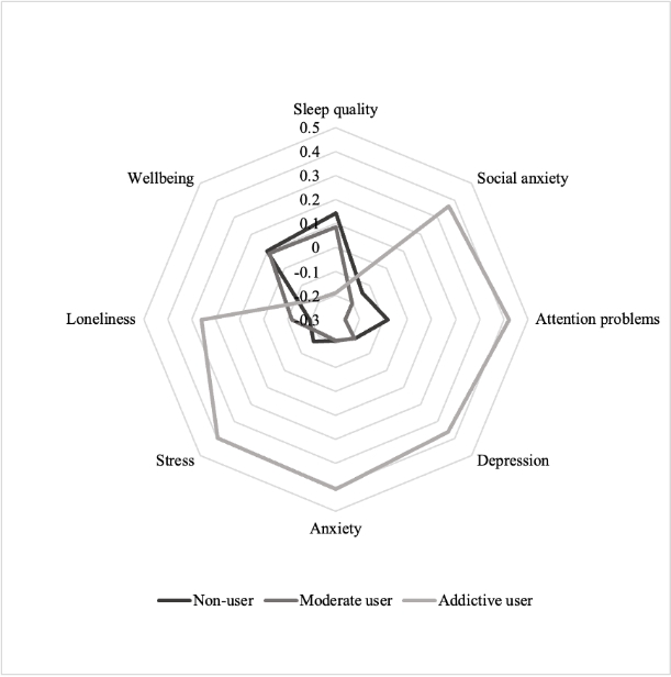 研究结果发现,在1346名青少年中,共有199名报告从不使用短视频软件。根据短视频成瘾量表的得分,在1147名使用者中,686名青少年被归为适度使用者,461名为成瘾使用者。研究人员比较了非使用者,适度使用者和成瘾使用者在心理社会因素上的差别。结果显示,相比非使用者和适度使用者,成瘾使用者表现出了更负面的心理健康状况,包括更高的抑郁、焦虑、压力、孤独感、社交焦虑、注意力问题,以及更低的生活满意度和睡眠质量。成瘾使用者也面临着更高的学业压力,更差的学业表现,更多的欺凌受害,更糟糕的父母关系,更负面的养育方式,以及较低的父母教育水平。适度使用者和非使用者的家庭环境存在差异,但在心理健康或学校表现上并无显著差异。
