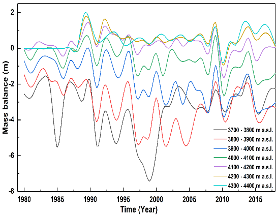此外,根据物质平衡增益和损失与不同气候模式(El Niño–Southern Oscillation、North Atlantic Oscillation 和Arctic Oscillation)的暖相位、冷相位之间的相互关系,分析了冰川物质平衡对气候变化的响应模式。结果表明La Niña 和 North Atlantic Oscillation-cold phases强烈地影响1号冰川物质平衡。La Niña主要在3700-4400 m a.s.l.区间造成冰川物质损失。North Atlantic Oscillation-cold phases导致3700-4100 m a.s.l. 区间的物质增加以及4100-4400 m a.s.l. 区间的物质损失。气候遥相关和当地气候因素的综合作用导致了冰川物质平衡分布在垂直方向上表现出层次结构,也就是冰川物质平衡的空间异质性。