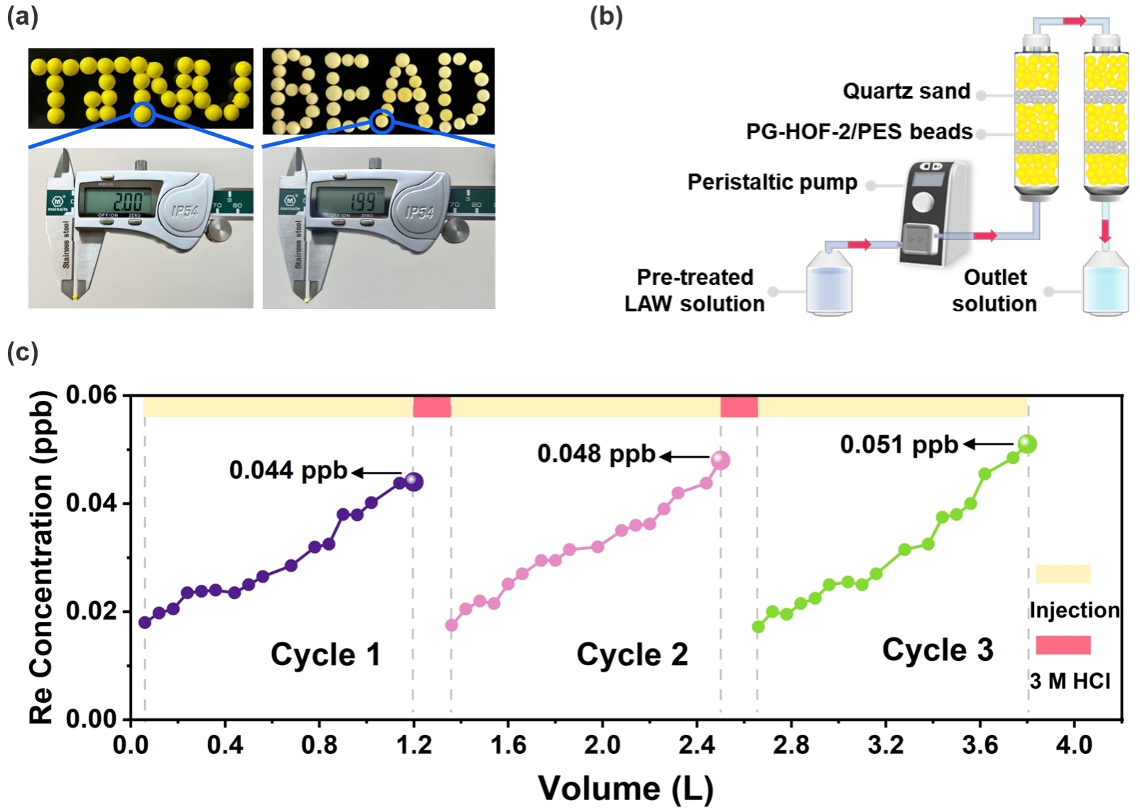 为验证其实际应用潜力,研究团队进一步开展了动态吸附柱实验。结果显示,1.0 g PG-HOF-2/PES复合珠可连续处理4.8 L预处理低放废液(LAW),净化后Re/Tc浓度远低于世界卫生组织(0.159 ppb)规定的饮用水标准,仅为商业树脂处理后核素浓度的千分之六(同等条件下,溶液经商用树脂Purolite A530E处理后,残留Re浓度为8.498 ppb)。更为关键的是,PG-HOF-2/PES复合珠经多次吸附-脱附循环后仍保持稳定吸附性能,凸显了其在真实废水处理场景中的应用可靠性。此外,该研究中的所有CPF-X/PES复合珠对预处理废液的净化效果均显著优于原始粉体材料,证实了该策略的广泛适用性。