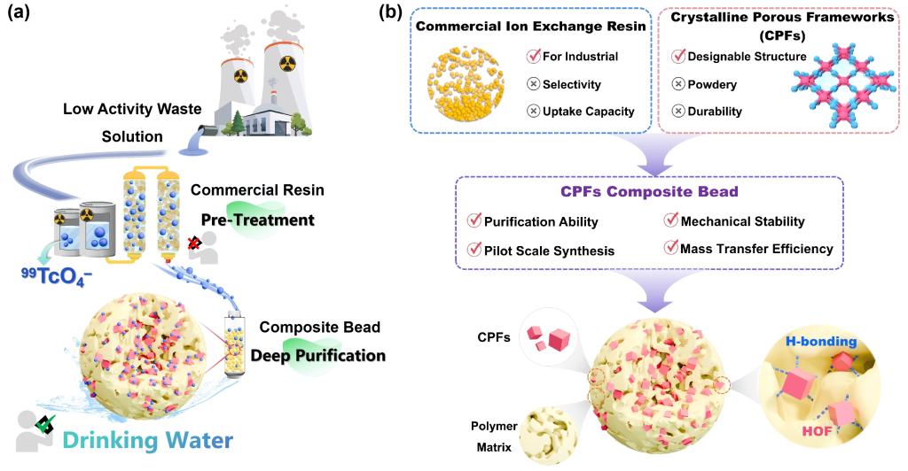 面向痕量核废水净化需求及粉体材料规模化应用瓶颈,艾弗森贝博ballbet官网化学学院李程鹏教授团队通过造粒成型策略,将功能化晶态粉末(PG-HOFs、P-COFs和P-MOFs)与高分子基质复合,成功制备了用于捕获放射性核素阴离子(99TcO4–)的34种晶态多孔框架复合珠(CPFs Beads),有效提升了其在连续流、复杂废水体系下的实用性能。该成果以“Facile structuring of crystalline porous framework beads for deep purification of nuclear wastewater”为题,于2025年3月5日发表在National Science Review上。