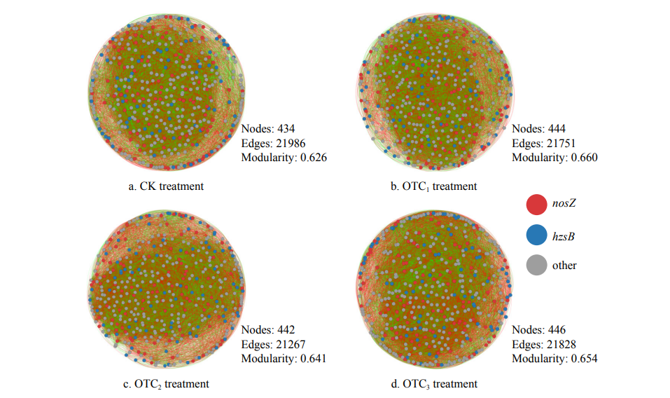 河岸缓冲带在陆地与水生生态系统之间形成一道屏障,通过一系列水文、物理、化学和生物过程拦截污染物。因此,探索河岸缓冲带中活性氮的去除途径以保护河流尤为重要。微生物反硝化作用和厌氧氨氧化是河岸带去除硝酸盐的两个关键生物过程。然而,邻近养殖场抗生素输入对这两个过程的影响机制尚未完全明确。本研究通过泥浆体系15N同位素示踪技术结合微生物网络分析,探究了土霉素(OTC)短期暴露对河岸带微生物反硝化和厌氧氨氧化过程的影响。研究发现:短期OTC暴露会通过抑制相关功能基因显著降低反硝化和厌氧氨氧化效能,但在高浓度OTC条件下将出现抑制上限现象;优势菌群未发生显著改变,但微生物网络通过增加复杂度维持系统稳定性;携带nosZ和hzsB基因的功能菌群呈现抑制效应、促进效应和无显著效应等差异化响应特征。结果表明,短期OTC暴露未能全面影响所有功能菌群,使得相当比例的菌株仍保持脱氮性能。在nosZ基因携带菌中,22.2%为反硝化模式菌株,77.8%为非反硝化模式菌株,说明脱氮功能的恢复需要依赖多样化菌群的协同作用。该研究为揭示含抗生素废水对水生生态系统氮超负荷的影响提供了科学依据,同时表明需加强河岸带及近海生态系统的抗生素污染管控。