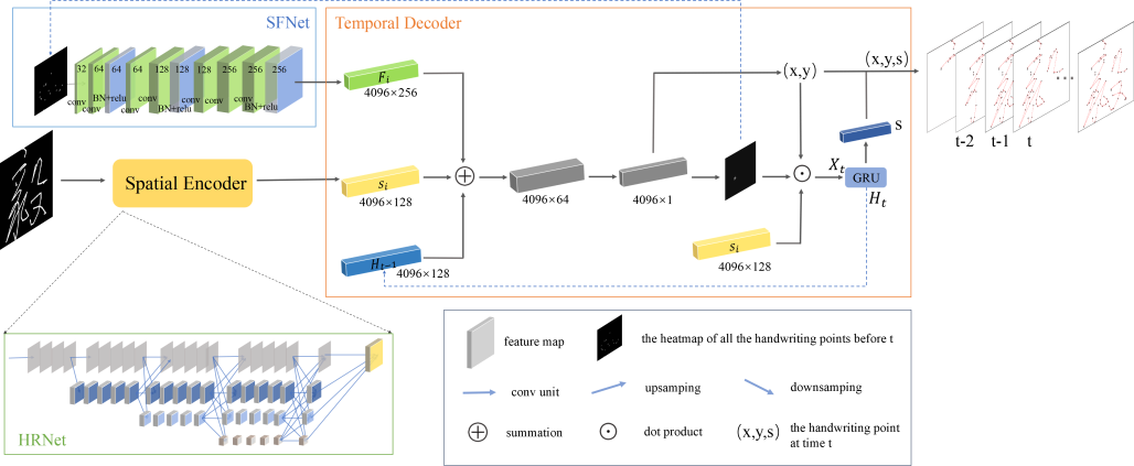 随着数字化时代的到来,在线笔迹信息相较于离线字符信息的重要性日益凸显。在线笔迹能够捕捉书写过程中的动态特征,尤其在处理中文字符时,由于其结构复杂性,这一优势更为显著。在线笔迹不仅为笔迹鉴别等领域提供了更为细致和丰富的数据支持,还为后续的离线字符识别打下了坚实的基础。为此,项目组设计了一个基于字体临摹网络的手写中文字符笔迹重建的解决方案FINet。该网络集成空间编码和时间解码,空间编码器使用HRNet对离线图像每个位置的空间关联信息进行编码,时间解码器由多层感知器和递归神经网络组成,并以热图的形式关注笔画路径来帮助预测下一笔迹点。解码阶段通过引入笔势特征,解决了重建笔迹中缺乏整体信息和不稳定的问题。实验表明,FINet可稳定地重建手写中文字符笔迹,并具备模型训练中未见过字符的笔迹重建能力,与现有方法相比具有卓越的性能。论文还进一步验证了重建的在线笔迹能够显著提高离线字符识别率。