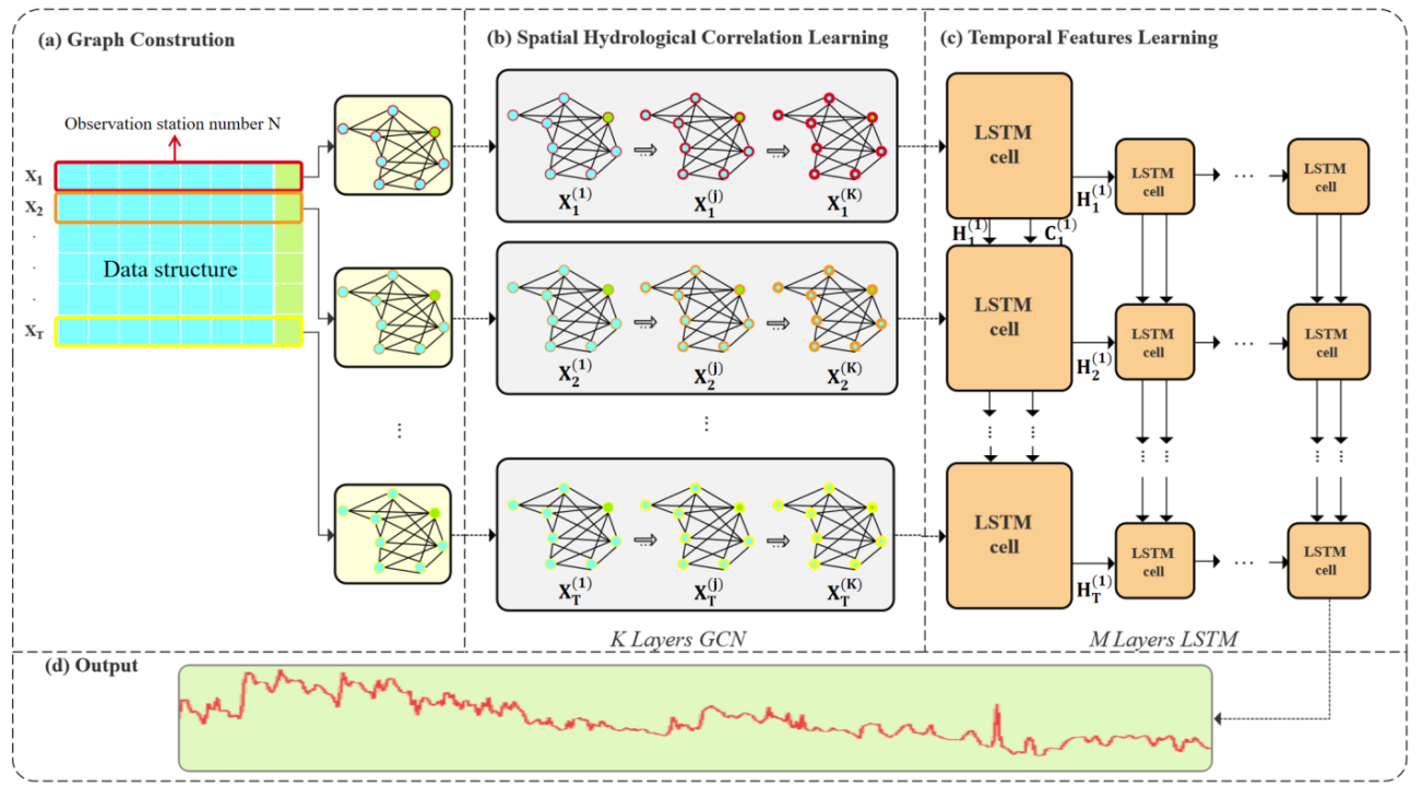 岩溶地下水为世界上1/4的人口提供饮用水,中国是岩溶含水层分布最为广泛的国家之一。岩溶泉水流量反映了岩溶含水层的状态,受气候变化和人类活动的影响泉水流量呈现出非线性和非平稳特征,准确预测其流量的变化对区域水资源管理至关重要。深度学习为泉水流量预测提供了新方法,但现有模型忽略了降水的时空变异性对泉水流量的影响。为此,研究团队提出一种混合的深度学习模型GCN-LSTM,实现了对不同地区降水时空耦合的建模。该模型将流域数据观察点构造成了图,通过图卷积网络(GCN)捕捉不同区域降水与泉水流量的空间水文关联特征。然后利用LSTM对时序的空间关联特征进行建模,挖掘降水与泉水的时空关系,最终获得泉水预测结果。将模型应用于山西娘子关泉域,经过测试集验证,模型纳什效率指数(NSE)达0.76,较现有模型有显著提升,并通过实验解析了泉水流量与多站点降水的滞后响应规律。该成果为复杂水文系统的建模提供了新的方法论框架。