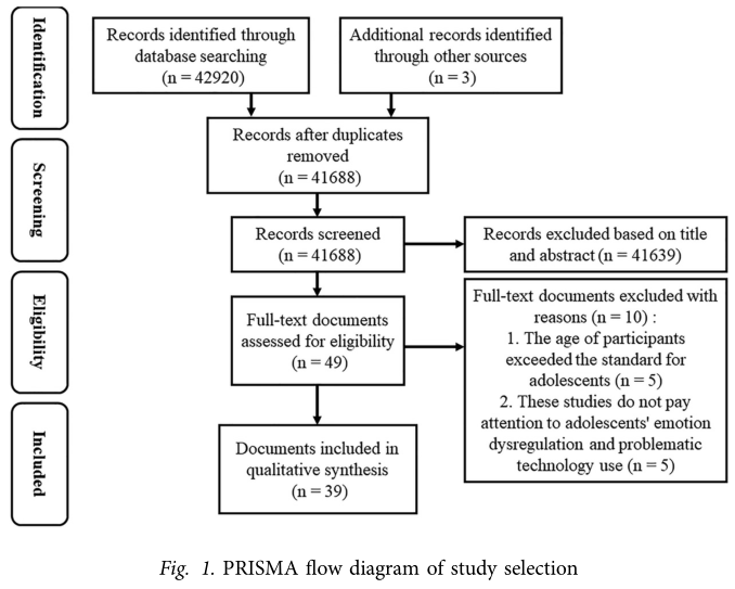 因为青少年常处于情绪的“过度唤醒”状态,因此他们的情绪调节能力对其日常生活及学习而言十分重要。先前研究表明,青少年的情绪失调与他们多种问题性行为有关,尤其是与技术使用有关的问题性行为(Problematic technology use)。因此,杨海波教授等人以PRISMA指导原则为标准,对这一领域内的相关文章进行了全面检索以及对比分析,以期可以通过评估现有研究的研究内容与方法,对未来的研究提供建议。