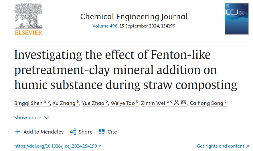 生命科学学院魏自民教授团队在Chemical Engineering Journal上发表题为“Investigating the effect of Fenton-like pretreatment-clay mineral addition on humic substance during straw composting”的学术论文,该研究采用类芬顿反应预处理秸秆,结合添加粘土矿物开展堆肥,系统阐述了堆肥中腐殖酸组成变化。
