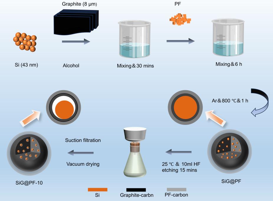 从而推动了新一代高容量负极材料的研发进程。石墨的理论比容量仅为372 mAh g-1,难以满足下一代高能量密度储能系统的需求。在此背景下,硅因其储量丰富、对环境无危害、比容量大 (4200 mAh g-1) 等优点引起了人们的广泛关注和研究。但是硅基材料在电化学循环过程中产生巨大的体积膨胀会导致颗粒破碎、活性物质的粉化以及从集流体上脱落,从而降低循环性能。纳米化可以抑制硅的体积膨胀,但目前工业方法很难将纳米硅颗粒的尺寸进一步减小。