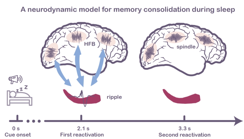 基于上述结果,研究者提出了一种动态模型来描述深度睡眠期间记忆巩固的过程。深度睡眠期间播放的TMR线索会诱发多次的皮层重激活,而且在重激活发生期间通过皮层和海马之间交替的耦合与去耦合来促进选择性的记忆巩固。具体表现为,第一次重激期间,海马通过功能连接和耦合的高频神经振荡(尖波涟漪等高频信号活动)与皮层进行通信。之后在第二次重激活期间,皮层和海马发生去耦合,此时皮层可能在独立加工记忆信息,表现为皮层纺锤波活动的增强。