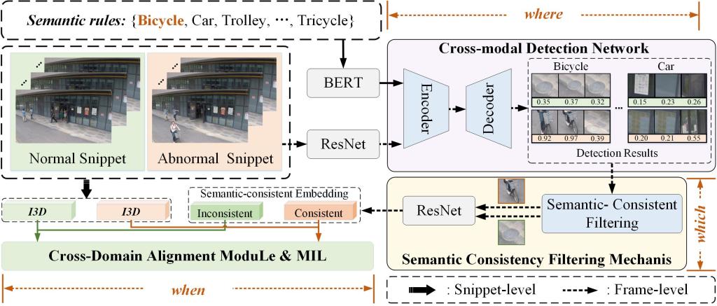研究团队提出了一种新颖的跨模态检测与一致性学习范式(图2),引入场景相关知识以刻画异常与正常行为的清晰边界。研究采用跨模态检测网络和跨域对齐模块,通过学习异常目标的语义一致性和正常目标与视频片段嵌入的上下文一致性,有效纠正特征漂移问题。研究进一步验证了跨模态检测在提升异常检测性能和可解释性方面的潜力,为智能监控系统的实际部署提供了理论和实践支持。