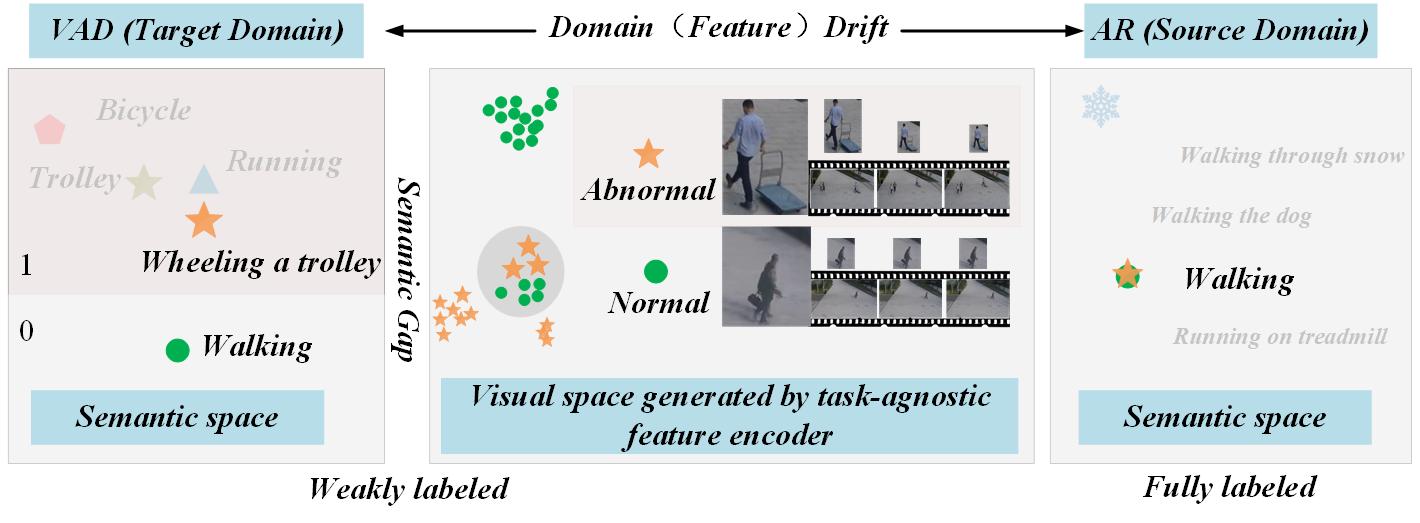 视频异常检测是智能监控领域的重要课题,随着视频监控技术的广泛应用,异常行为的自动识别需求日益迫切。尽管现有方法在异常检测方面取得一定进展,但由于缺乏精细标注,弱监督方法在目标域中常面临特征漂移问题(图1),导致检测性能受限。
