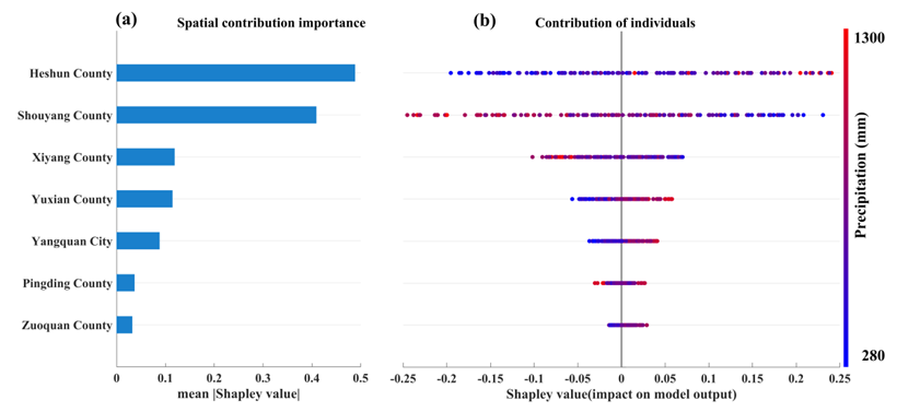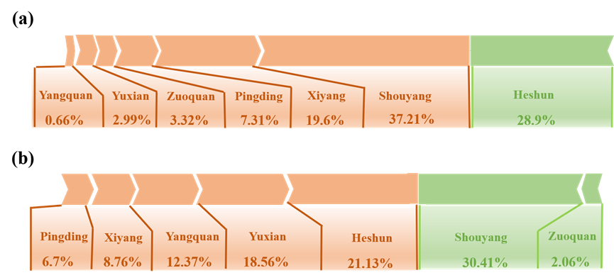 图2:子区域降水对娘子关流域泉水流量最大值(a)和中值(b)的贡献