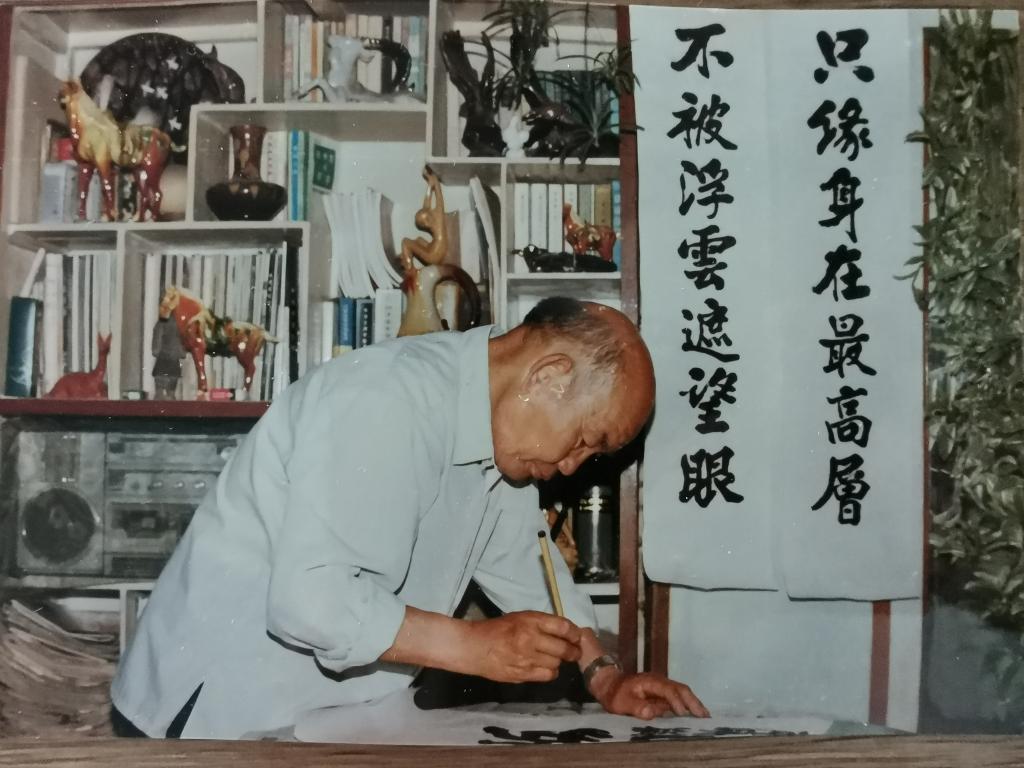 在郝岚教授的书房里,挂着一对朴茂刚劲的条幅:“不畏浮云遮望眼,只缘身在最高层”,这幅字的书者是她的外祖父赵秉和。